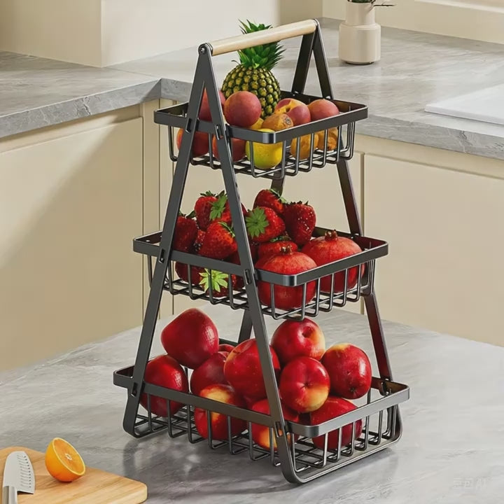 Este organizador metálico de tres niveles no solo es funcional, sino que también aporta un toque moderno y elegante a tus espacios. Su diseño vertical permite aprovechar el espacio de forma eficiente, mientras que su estructura resistente lo hace ideal para almacenar frutas, verduras, snacks, utensilios de cocina y más.
